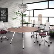 Mesa de juntas fabricada en melamina de 28mm. con canto plano termoadherido y base metálica en acabado de pintura electrostática.