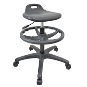 Banco cajero de asiento de polipropileno inyectado, con pistón neumático para ajuste de altura, mecanismo fijo, base de cinco puntas con rodajas o regatones a elegir y aro descansa pies.